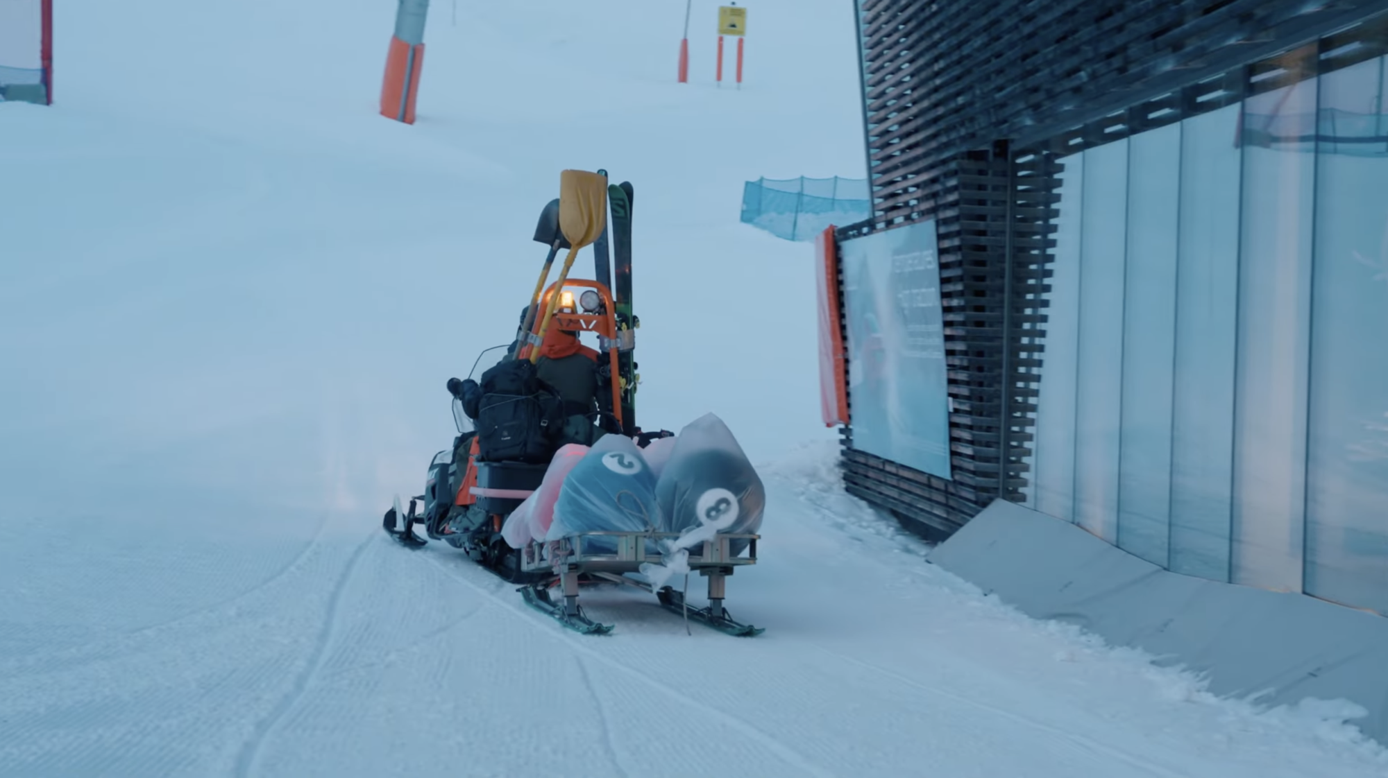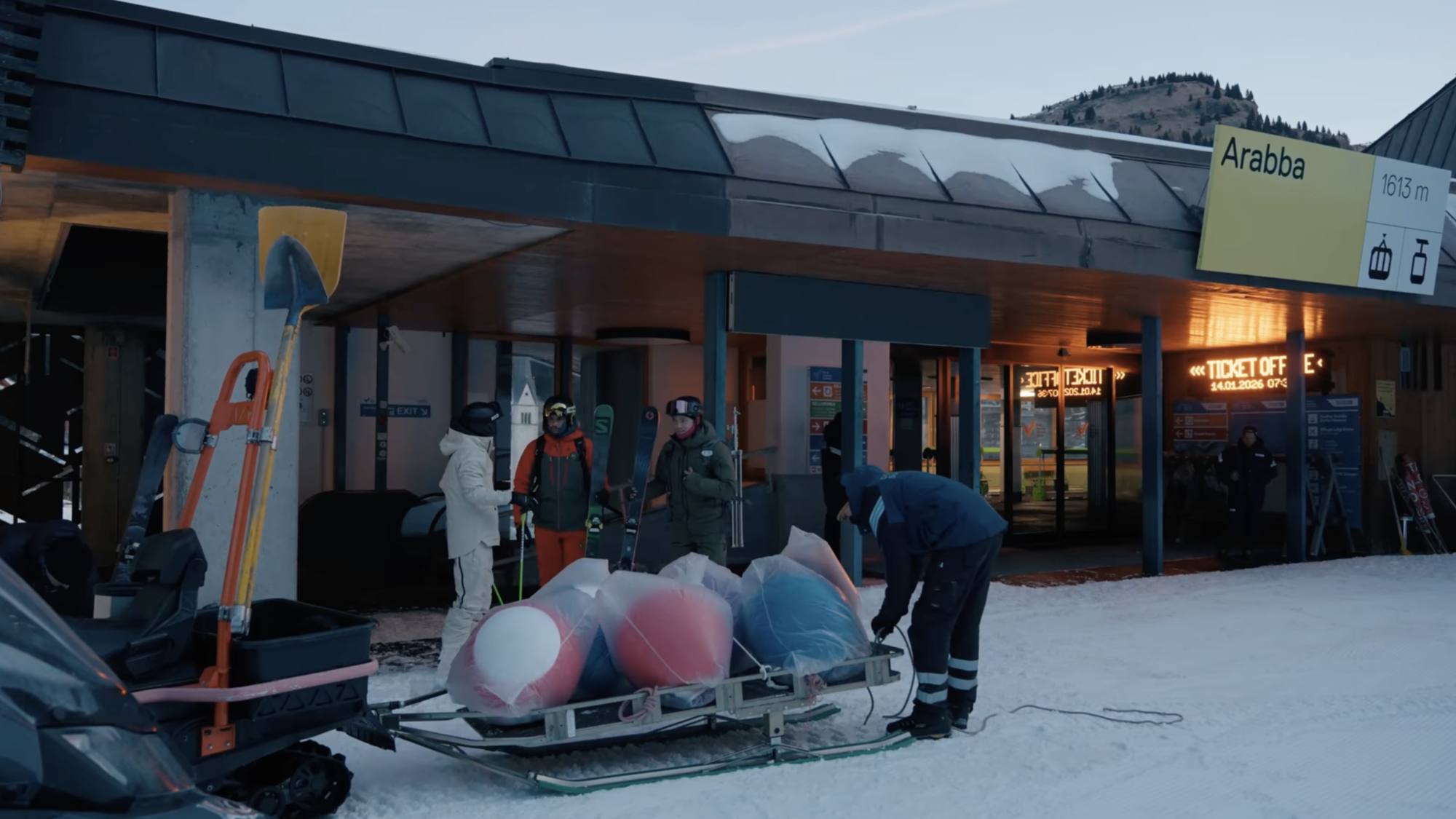 Supporto da parte degli impiantisti di Funivie Arabba per il trasporto logistico durante lo shooting di “Un Biliardo. Verticale.”